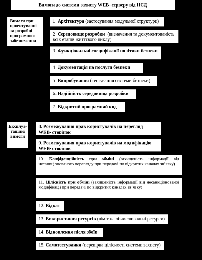 Визначена інтегральна оцінка ефективності захисту від НСД WEB-серверів Apache та IIS із урахуванням відповідної вітчизняної нормативної бази: Apache Zaw=14, IIS Ziw=13. При цьому максимально допустима величина оцінки Zw=15. Таким чином, ефективність захисту від НСД як Apache, так і IIS досить висока. Важливим напрямком підвищення рівня захисту від НСД для Apache і IIS є введення в них функцій самотестування та доукомплектація супроводжуючої документації відповідно вітчизняних державних стандартів.
