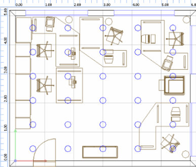 Площа кабінету складає 32.5 м2. А об’єм 97.5 м3. Таким чином на одного робочого припадає: площі – 6.5 м2 і об’єму 19.5 м3, що відповідає державним санітарним правилам і нормам 3.3.2.007-98(6м2 та 19.5 м3 ). На малюнку нижче приведений план приміщення з місцезнаходженням робочих місць (мал.2).