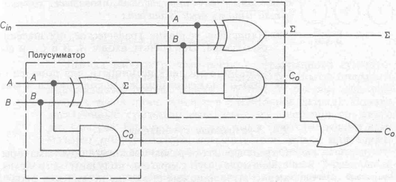 На рис. 7.5.3 показана розгорнута логічна схема повного суматора. Вона основана на структурній схемі з двома напівсуматорами.