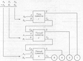 Певним чином поєднуючи між собою напівсуматори та повні суматори отримують пристрої, що одночасно виконують додавання декількох двійкових розрядів. Пристрій, схема якого показана на рис. 7.5.5. виконує операцію додавання двох 3-розрядних чисел. Числа-доданки А2А1А0 і В2В1В0. Сигнали, що відповідають значенням розряду одиниць в доданках, поступають на вхід суматора розряду одиниць (напівсуматора). Вхідними сигналами для повного суматора розряду двійок є сигнал переноса з виходу напівсуматора (подається на вхід Сin) і значення А1 і В1 розряду двійок і доданків. Далі суматор четвірок складає А2 і В2 і сигнал переносу з суматора двійок. На двійковому виході пристрою (показано в правому нижньому куті рис. 7.5.5) встановлюється двійкова сума.