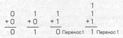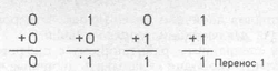 Оскільки в двійкових числах присутні лише дві цифри (0 і 1), таблиця додавання досить проста. Вона приведена на рис. 7.5.1. Як і в випадку додавання десяткових чисел, три перших результати не викликають питань. Що стосується останньої задачі (1+1), то при складанні десяткових чисел в даному випадку відповіддю було б число 2. Таким чином, при двійковому додаванні 1+1=0 плюс перенос 1 в сусідній старший двійковий розряд.