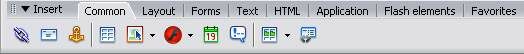 Панель Insert (Вставка) (рис.5), включающая следующие вкладки: Common (Основные) - вставка гиперссылок, таблиц, рисунков, комментариев и т.д., а также Tag Chooser (Выбор тега); Layout (Разметка) - использование ячеек и таблиц для разметки документа перед добавлением содержимого; Forms (Формы) - добавление различных видов форм; Text (Текст) - форматирование текста и Font Tag Editor (Редактор тегов текста); HTML - добавление горизонтальной линии, элементов таблицы, фреймов, свойств head, скриптов; Application (Приложения) - работа с информационными структурами; Flash elements (элементы Flash) - добавление Flash-роликов, Favorites (Избранное) - возможность добавления на отдельную вкладку наиболее часто используемых объектов.