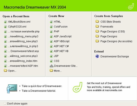 При загрузке Dreamweaver появляется стартовое окно (рис.1), позволяющее выбрать тип нового создаваемого документа (HTML, ColdFusion, PHP и др.), либо создать документ по готовым образцам (CSS Style Sheets, Framesets и др.), а также открыть недавно использовавшиеся документы. Кроме этого имеются ссылки на интернет-ресурсы: сайт Dreamweaver MX Exchange, обзор программы Dreamweaver MX и справочная информация по Dreamweaver MX.