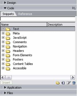 Группа панелей: Design (содержит стили CSS), Code (содержит справку по тегам, объектам и функциям различных технологий), Application (содержит информацию о базах данных, компонентах и т.д.), Files (Диспетчер файлов) (Рис.6).