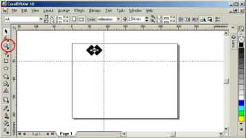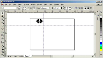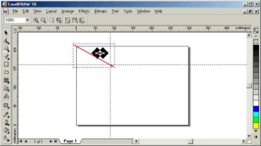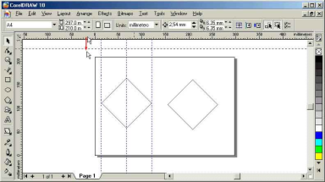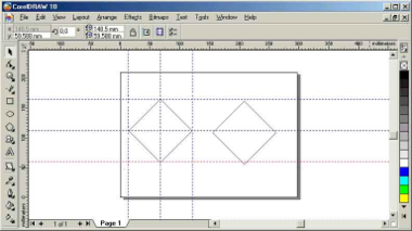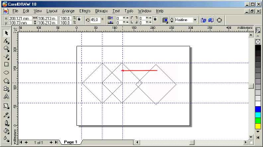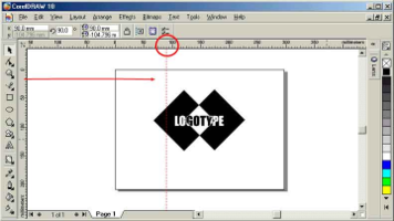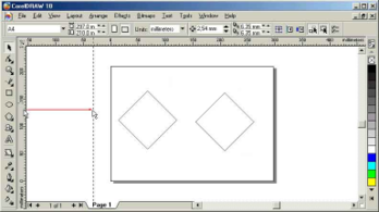 Давайте воспользуемся одной из очень полезных функций программы – работа с направляющими линиями («Guidelines»). Такие линии служат для более точного расположения объектов. Например, можно сделать так, чтобы фигуры как бы «прилипали» к линиям. Разместить линии очень легко. Щелкните мышкой на линейке, расположенной слева, и, не отпуская кнопку, двигайте курсор вправо. Появилась вертикальная пунктирная линия.