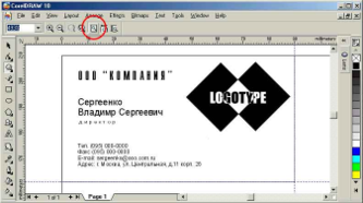 Визитка готова. Вернемся к масштабу просмотра всей страницы. Для этого выбираем инструмент «Zoom Tool» и щелкаем по кнопке, обозначенной на иллюстрации.