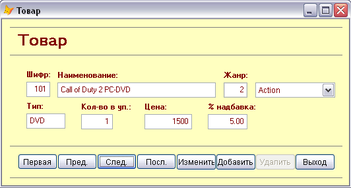 Форма "Товар" показывает информацию о доступном товаре, так же можно отредактировать, удалить и добавить данные (Рисунок 10). Выбор жанра осуществляется через выпадающий список.