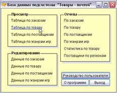 При старте программы запускается главное меню приложение, структура которого представлена в таблице 1, и главная форма, макет которой представлен на рисунке 7. Главная форма программы (main) позволяет перейти на любую форму системы управления базой данных, вызвать на выполнения запросы и отчеты.