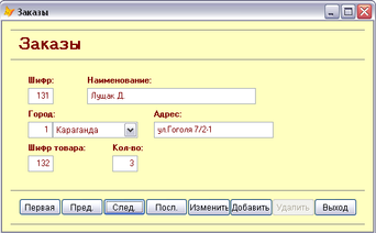 Для просмотра, ввода и редактирования данных, хранящихся в таблицах, используются формы, являющиеся более наглядным средством представления информации. В рамках данной курсовой работы все формы были построены с помощью конструктора форм. Все функции кнопок, расположенных на формах приложения, описаны в листинге программы (Приложение А). Форма "Заказы", представленная на рисунке 8, позволяет осуществить просмотр всех сведений о заказах, отредактировать их, удалить и добавить данные. Для перехода по записям используются кнопки навигации.