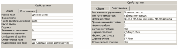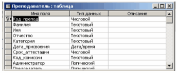 В режиме конструктора в бланке таблицы можно установить свойства полей, главные из которых Имя поля (не более 64 символа), Тип данных, Размер поля.