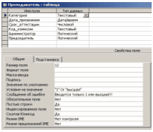 В перечне свойств щелкнуть на параметр Условие на значение и ввести (“1” OR “2” OR “высшая”). Имеется ввиду, что на поле категория накладывается условие, т.е. можно вводить 1 либо высшая в противном случае будет выводиться сообщение.