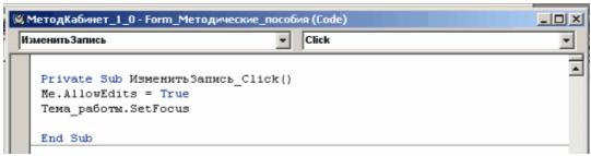 Когда пользователь щелкает по кнопке Изменить запись код выполняет и делает форму доступной для изменения. при перемещении пользователя к другой записи или сохранении текущей записи необходимо вернуть форму в состояние, в котором она доступна только для чтения, чтобы записи не были подвержены случайным изменениям до тех пор, пока снова не будет нажата кнопка Изменить запись.