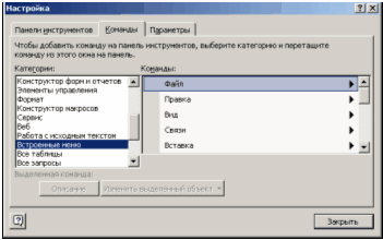 В диалоговом окне Настройка открыть Команды. В списке Категории выберите Встроенные меню.