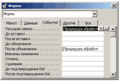 Щелкнув правой кнопкой мыши на кнопке Изменить запись и в появившемся меню выбрать Обработка событий.