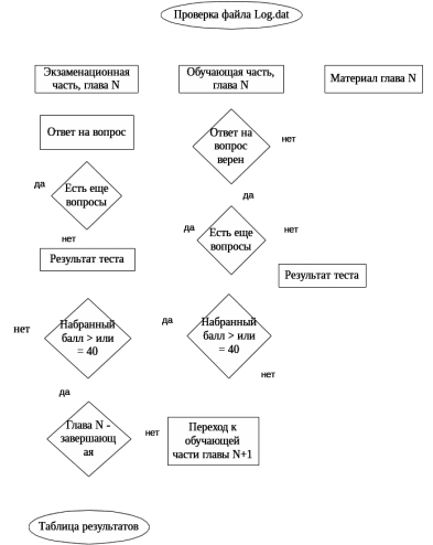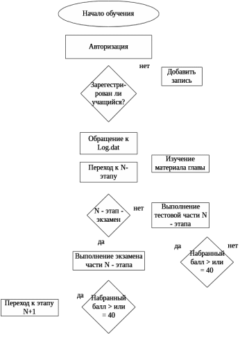 Обучение начинается с авторизации. Если учащийся не зарегистрирован, то в базе создается запись, в которую включены фамилия, группа и пароль учащегося. Программа проверяет файл Log.dat, если учащийся зарегистрирован и уже проходил тестирование, то он может перейти к тому месту, где он остановился – на тесте или на экзамене по главе N, либо приступить к изучению теоретического материала. Если студент приступает к выполнению тестовой части, то он может проверить свои знания по главе, с возможностью обращения к учебному материалу при неправильном ответе. Если в результате теста учащийся получает балл ≥ 40, то он переходит к выполнению экзаменационной части, к ней он может перейти еще непосредственно вначале, если тестовая часть по данной главе уже была выполнена ранее. Если же балл < 40, то учащийся повторяет учебный материал, а затем снова приступает к выполнению теста. Если студент приступает к выполнению экзаменационной части, то в отличии от тестовой он не имеет возможности знать правильный ли он дал ответ и не может вернуться во время экзамена к разделу материал. Если в результате экзамена балл студента < 40, то он повторяет материал и снова пытается сдать экзамен. Если же учащийся получает балл ≥ 40, то он переходит к теоретической части следующей темы.