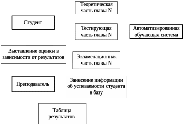 Студент приступает к работе, он начинает с изучения материала изучаемой главы. Объем учебного материала определяется спецификой изучаемой с помощью АОС дисциплины. Изучив теоретический материал, учащийся переходит к тестирующей части главы по изучаемой им теме. При тестировании учащийся может в случае неправильного ответа вернуться к теоретической части. Если набранный балл достаточно высок, то учащийся переходит к выполнению экзаменационной части по изучаемой главе. Результаты записываются в базу. В случае успешного выполнения экзаменационной части, таблица результатов контролируется преподавателем, учащемуся выставляется соответствующая оценка.