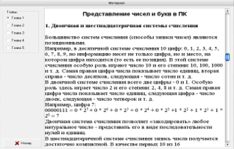 В разделе “материал” находится текстовое изложение пяти глав учебного материала.