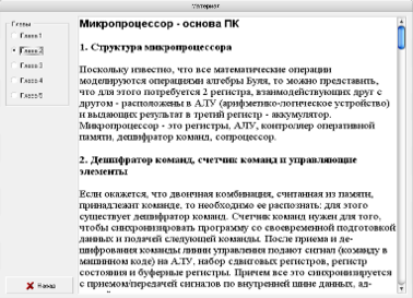 Текст для разделов находится в формате RTF и загружается в программу. (см. приложения, листинг 1) Для каждой главы существует свой RTF файл, названный в соответствии с номером главы.