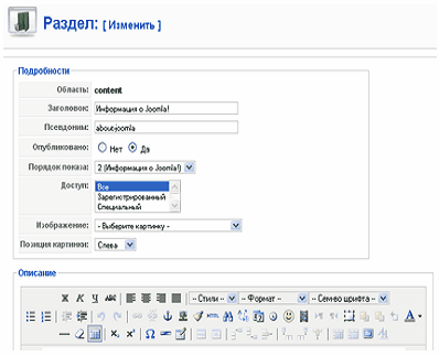 У текстовому полі "Описание" можна написати короткий опис (анотацію) вмісту розділу.