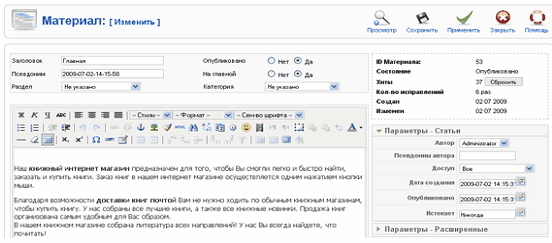 При створенні або редагуванні об'єкту вмісту (статті), на сторінці редагування (рис.15) доступні додаткові поля, необхідні для вибору того (на відміну від сторінки редагування розділу або категорії), в якому розділі (поле "Роздел:") і в якій категорії (поле "Категория:") міститиметься даний об'єкт вмісту.