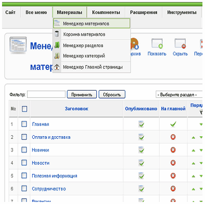 Для роботи з розділами необхідно перейти на сторінку "Разделы". Можна натиснути на головній сторінці панелі кнопку "Разделы" або в основному меню вибрати "Материалы", потім пункт "Менеджер разделов" (Рис. 10).