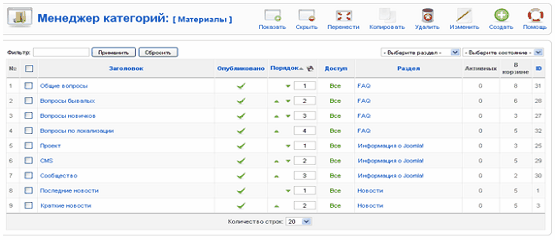 На сторінці «Менеджер категорий», використовуючи кнопки на панелі інструментів, можна (перерахування справа наліво):