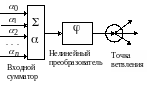 Стандартный формальный нейрон составлен из входного сумматора, нелинейного преобразователя и точки ветвления на выходе (рис. 5).