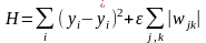 – текущий выходной сигнал сети на i-м примере обучающей выборки). Для упрощения нейросети с несколькими выходными сигналами в первом слагаемом для каждого примера суммируются невязки всех выходных сигналов сети [28,29]. Штраф за веса синапсов wjk (второе слагаемое) входит с регуляризующим весом , от величины которого зависит баланс между точностью решения задачи и простотой структуры сети.
