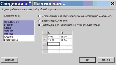 Вкладка Рабочие недели. Содержит список описаний видов используемых в проекте рабочих недель. Рабочая неделя задает рабочий график по дням недели (с понедельника по воскресенье). В проекте можно использовать рабочие недели разных видов: обычные (нормальный график), «штурмовые» для экстренных случаев (все дни недели являются рабочими, рабочий день длится 10 часов), «облегченные» (рабочий день длится до обеда) и т.д. В системе предопределен не удаляемый вид По умолчанию, срок действия которого неограничен. Он используется для описания нормального рабочего графика, принятого в организации. Все остальные описания рабочих недель уточняют этот график в заданный период времени и не должны пересекаться между собой. Описание рабочей недели состоит из названия, дат начала и окончания ее действия, а также графиком работы, который задается в окне сведений, открываемом кнопкой Подробности. Это окно изображено на рис. 3.5. Список Выберите дни используется для выбора дней, для которых требуется изменить график работы. Щелчок мыши с удерживанием нажатой клавиши Ctrl позволяет выделить сразу несколько дней. Переключатель Использовать для этих дней значения времени по умолчанию задает для выбранных дней стандартный график (9:00–13:00 и 14:00–18:00). Чтобы сделать день недели нерабочим, нужно установить переключатель Задать нерабочие дни. Для использования нестандартного графика предназначен переключатель Задать дни для использования этих рабочих часов, при использовании которого следует заполнить таблицу промежутков рабочего времени. Так на рис. 8 для всей недели с понедельника по пятницу устанавливается нестандартный график 8:00–12:00 и 13:00–17:00.