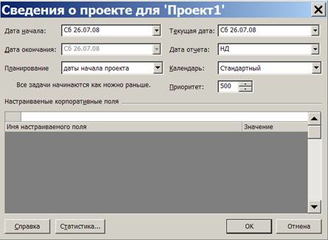 Прежде всего необходимо задать ключевые параметры проекта в окне сведений о проекте (пункт меню Проект / Сведения о проекте), изображенном на рис. 5. Установки этого пункта имеют определяющее значение для всего последующего процесса планирования.
