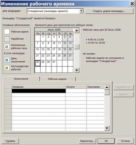 Таблица календаря. Отображает график рабочего времени выбранного календаря. Слева от таблицы в виде легенды изображены способы отображения различных фрагментов календаря: рабочее, нерабочее и измененное рабочее время, дни исключений и нестандартных рабочих недель. Справа от таблицы отображается график рабочего времени для выбранного дня таблицы (на рис. 6 для даты 28.07.08 рабочими часами являются промежутки 9:00–13:00 и 14:00–18:00).