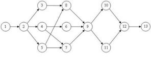 Каждая из работ в таблице 2 соответствует вершине на сетевом графике и обозначается кружком, в который заносится ее номер. Кружки соединяются стрелками. Стрелка соответствует одному из чисел столбца Предшественники и соединяет работу-предшественник с работой-последователем. Результат изображен на рисунке 9.
