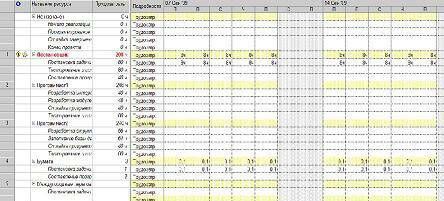 Левая таблица содержит список задач, которым еще не назначены ресурсы (к таким относятся вехи и фазы), и список ресурсов с указанием их суммарных трудозатрат по проекту. Под каждым ресурсом перечислены все задачи, в выполнении которых он участвует, и его запланированные трудозатраты на эти задачи. Правая таблица – это сводный календарный график трудозатрат ресурсов по проекту. При помощи ее контекстного меню состав данных этой таблицы может быть изменен и помимо трудозатрат включить следующие показатели: