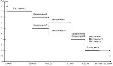 Календарный график (диаграмма Ганта) изображен на рисунке 15, где ромбиками обозначены вехи, сплошными линиями – продолжительность работ, сплошными линиями со стрелками – резерв времени работ, пунктирными линиями – связь между окончанием предшествующих и началом последующих работ[11].