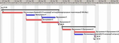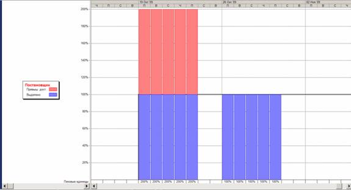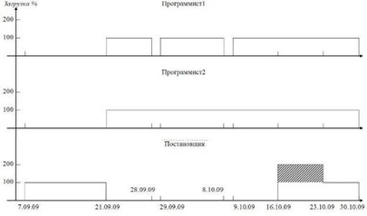 Обычно исполнитель целиком занят решением некоторой задачи и по ее завершении переходит к следующей. Это соответствует 100% загрузки. Однако, в некоторых случаях он может быть параллельно задействован в 2 или более задачах, выделяя для их решения часть рабочего времени. Например, две задачи по 50% каждая, то есть по половине рабочего дня на задачу. График загруженности ресурса позволяет в этом случае контролировать суммарную занятость исполнителя и выявить возможные периоды перегрузки, когда ему запланировано больше работы, чем он может выполнить в течение рабочего дня. Об этом свидетельствует суммарная загруженность более 100%.