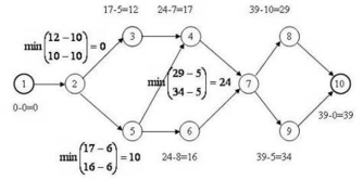 Поскольку последняя работа проекта – это веха нулевой длительности, раннее время ее начала совпадает с длительностью всего проекта. Обозначим эту величину T. Теперь T принимается за позднее время начала последней работы, а для остальных работ позднее время начала вычисляется по формуле: