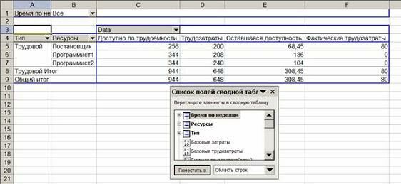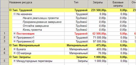 Пример таблицы с выполнением данного вида анализа приведен на рисунке 24. Здесь для разделения ресурсов используется тип ресурса: трудовой, материальный или затратный. Как видно из таблицы, львиную долю затрат по проекту составляет заработная плата сотрудников, которая составляет 231500 р.