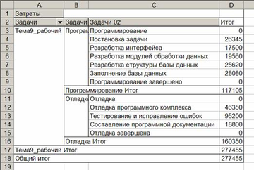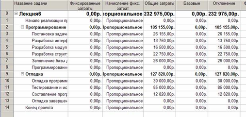 Эта же таблица используется для анализа стоимости проекта. В ней отражены: