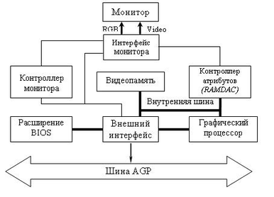 Внутренняя шина адаптера предназначена для высокопроизводительного обмена данными между видеопамятью, графическим акселератором и внешним интерфейсом. Типовая разрядность канала данных у этой шины 64/128 бит. Однако реально используемая разрядность может оказаться меньшей, если установлены не все предусмотренные микросхемы видеопамяти.