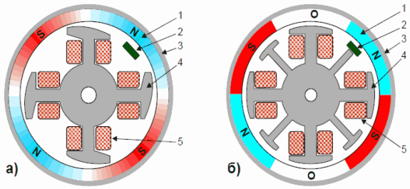 3 - магнитопровод (ярмо) якоря; 4 - магнитопровод статора; 5 - обмотка статора