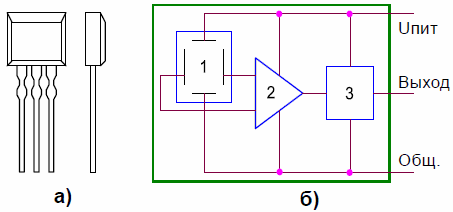Для усиления выходных сигналов датчика Холла совместно с ним необходимо использовать один или более транзисторов. В настоящее время на одном кристалле устанавливают как элемент Холла, так и некоторые электронные схемы, образуя холловскую интегральную схему (ХИС). Внешний вид типичной ХИС, а также ее функциональная схема, показаны на рис.2.10.