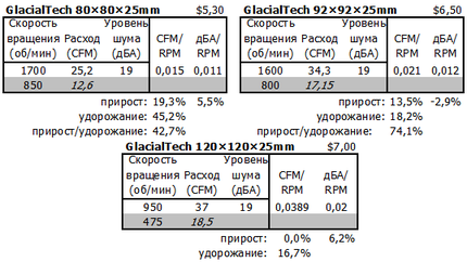 Теперь рассмотрим линейку вентиляторов другого производителя: GlacialTech SilentBlade 80×80×25 мм, 92×92×25 мм и 120×120×25 мм. Составим аналогичную таблицу 1.4