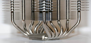 Радиатор изделия состоит из 20 больших и 27 малых алюминиевых ребер крестообразной формы толщиной 0,5 мм. Ориентировочная поверхность теплорассеивания равна 9400 кв. см. Весьма внушительная цифра. Ребра отстоят друг от друга достаточно далеко, чтобы не затруднять естественный воздухоток и не собирать пыль хлопьями. Производитель утверждает, что форма ребер радиатора "аэродинамическая", то есть воздушный поток проходит между ними более быстро, нежели "обычно": крестообразная форма ребер способствует снижению тылового давления воздуха, а оптимальный зазор между ними улучшает воздухоток.