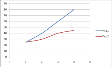 Рисунок 2.4 - Зависимость температуры БП до усовершенствования (ряд 1) и после усовершенствования (ряд 2); на вертикальной оси ˚С
