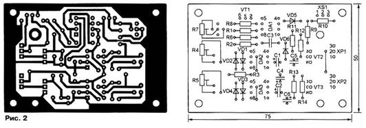 Печатная плата блока управления изображена на рис. 2.6. Она рассчитана на установку постоянных резисторов МЛТ-0,125, подстроечных СПЗ-44 А (R 4, R 5) и СП 4-3 (R 7).