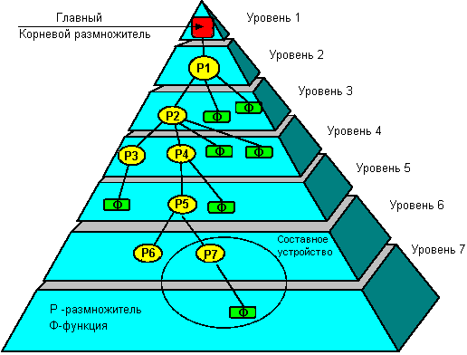 Архитектура шины USB выполнена аналогично локальной сети на витой паре, т.е. как многоуровневая звезда (рисунке 2). При этом шина USB соединяет внешние USB-устройства с главным USB-портом (host). Топология многоуровневой звезды подразумевает, что центром каждого разветвления (звезды) является размножитель (hub). Каждая связь выполняет двухточечное соединение между главным USB-портом и размножителем/функцией или между размножителем и другим размножителем/функцией. На рисунке 2 представлена топология шины USB. Вследствие задержек в распространении сигналов в размножителях и кабелях максимальное количество разветвлений (звезд) ограничено до 7, включая корневой уровень. Из 7 только на 5 уровнях могут быть установлены некорневые размножители, составляющих путь связи между любым устройством и главным USB-портом. Составное устройство занимает два уровня. На 7-ом уровне могут находиться только функции.