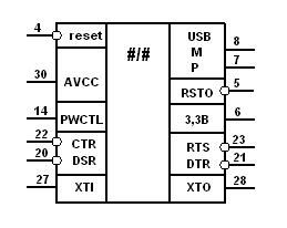 Встроенная схема формирования сигнала сброс генерирует импульс длительностью около 5 мс при превышении напряжением питания уровня 3,5 В. Сигнал сброса используется для внутренних цепей FT232BM и имеет дополнительно: вход "RESET" для принудительного сброса микросхемы преобразователя от внешнего устройства и выход "RSTOUT" для сброса других микросхем на плате.
