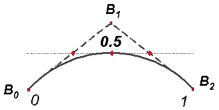 Вычислим значение кривой при параметре u=0.5. Как уже упоминалось, этот процесс состоит из серии линейных интерполяций. Проинтерполируем первую наклонную посередине длины. То же самое проделаем и со второй наклонной. Получим две точки. Соединяя их, получим новую наклонную. Проинтерполируем ёе посередине длины, получим значение кривой при u=0.5. Заметьте, что пришлось всего две интерполяции, чтобы вычислить значение кривой, и в общем случае нужно столько интерполяций, какова степень кривой. Подобную процедуру можно провести для вычисления значения кривой при любом значении u. Конечно, это всего лишь графический метод решения подобной задачи. Существуют также математические методы для решения этой проблемы (такие как метод Кокса-ДеБура), которые и используются в FastShip. Однако, графический метод полезен для более полного понимания математики NURBS, а также для демонстрации ряда важных свойств NURBS.