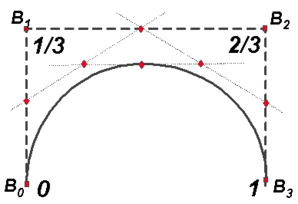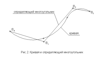 Определяющий многоугольник состоит из ряда вершин, обозначенных на рисунке B0 до B3, связанных отрезками прямых линий. Это и есть те вершины, по которым определяется действительная форма кривой. Как уже отмечалось ранее, кривая и определяющий многоугольник связаны набором функций полиномов, называемых базисными функциями В-сплайна.