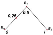 В качестве последнего примера рассмотрим линейный В-сплайн, показанный на рис.3.5. Определяющий многоугольник состоит из трёх вершин, обозначенных B0, B1, и B2. Что можно сказать об этой линейной кривой? Мы знаем, что нужно две точки, чтобы определить линию, так что здесь должно быть два линейных интервала. В узловом векторе нужно иметь три узла, чтобы определить два интервала, один - в начале, другой - в конце, третий - между первыми двумя. Для многих поверхностей, с которыми вы будете работать в FastShip, используется стандартный узловой вектор. Это значит, что внутренний узел находится на равном расстоянии, как от первого узла, так и от последнего. В дальнейшем мы будем рассматривать нестандартные узловые векторы. Следовательно, в данном примере узловой вектор будет иметь вид [0,0.5,1]. Тогда открытый узловой вектор с соответствующей многозначностью будет иметь вид [0,0,0.5,1,1]. Чтобы вычислить значение кривой при u=0.25 нужно рассмотреть наклоную B0B1, имеющие соответственно значения 0 и 0.5, и интерполировать эту наклонную посередине длины. Выясняется, что фактически для линейного В-сплайна определяющий многоугольник и линейный В-сплайн совпадают.